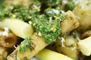 The most recent dish I made with pesto is a super simple one pot meal that has everything in it but the kitchen sink. Instead of just tossing pasta with pesto (which is a super easy dinner for a busy week), I added a few potatoes to the pasta pot and blanched a few yellow sting beans towards the end of the cooking process. That way I only dirtied one pot, but cooked three ingredients at once. If you've never tried a pasta dish with potatoes in it (I know it seem like carb overload) you really should. It's a great change in texture, especially with the crunchy yellow wax beans in there for some toothy bite. Tossed in a bowl with some fresh pesto, it was a tremendously easy dish. And if you want even less clean-up, try making the pesto ahead of time without the Parmesan cheese in it and freezing it (you can even freeze it in an ice cube tray). That way, all you have to do on a busy night is boil your pasta and veggies and heat the sauce up (or you could defrost it during the day), then add the Parmesan. Here's what I did: